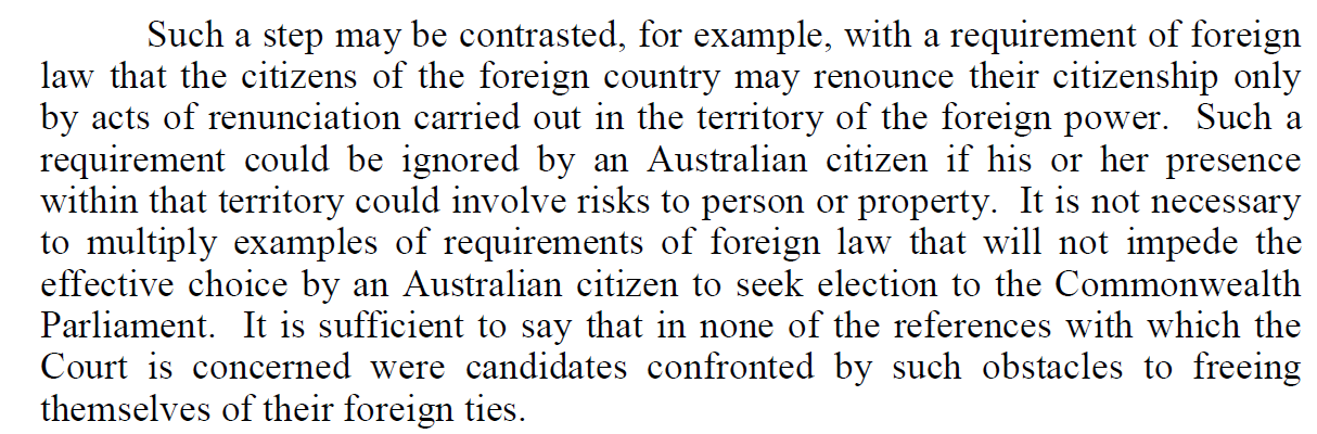Renouncing your citizenship could include a trip back to the old country of your parents or grandparents that you have never ever visited. Have do you decide if it is too dangerous? DFAT travel warnings, individual threats of harm or just the level of bribes you have to pay to get anything done.