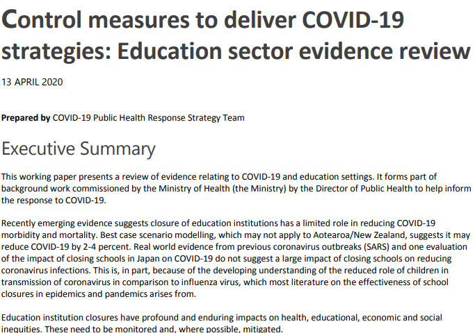 From https://www.health.govt.nz/system/files/documents/publications/covid-19_control_measures_to_deliver_covid-19_strategies_education_sector_evidence_review-21apr20.pdf and https://www.nzherald.co.nz/nz/news/article.cfm?c_id=1&objectid=12326496