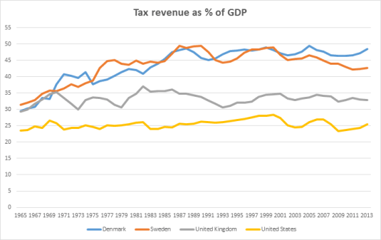 US, UK, Danish and Swedish tax revenues as % of GDP since 1966