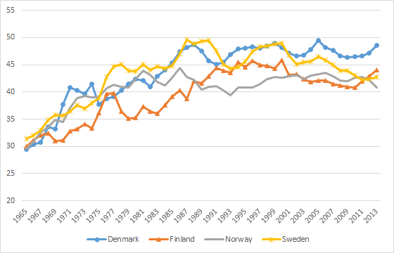 Scandinavian tax revenues as a % of GDP, 1965–2013