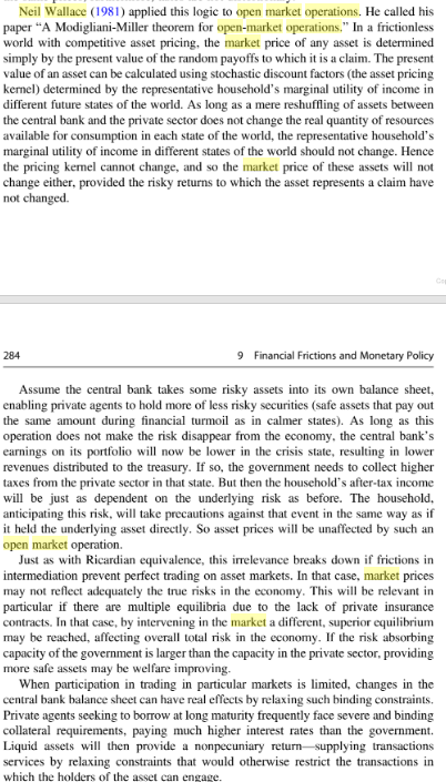 From https://books.google.co.nz/books?id=6kbCDwAAQBAJ&pg=PA283&lpg=PA283&dq=neil+wallace+open+market+operations&source=bl&ots=chwhTeUEA6&sig=ACfU3U1IPVipUeeC0tEa-phUVH7izIhT5A&hl=en&sa=X&ved=2ahUKEwihtKGGsZLpAhUdzDgGHSG4D5A4ChDoATACegQIChAB#v=onepage&q=neil%20wallace%20open%20market%20operations&f=false and https://www.jstor.org/stable/1802777?seq=1#metadata_info_tab_contents