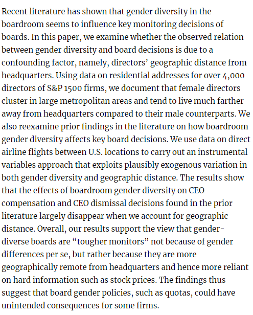 HT https://marginalrevolution.com/marginalrevolution/2019/03/do-female-board-members-matter.html from Alam, Zinat S. and Chen, Mark A. and Ciccotello, Conrad S. and Ryan, Harley E., Gender and Geography in the Boardroom: What Really Matters for Board Decisions? (December 18, 2018). Available at SSRN: https://ssrn.com/abstract=3336445 or http://dx.doi.org/10.2139/ssrn.3336445