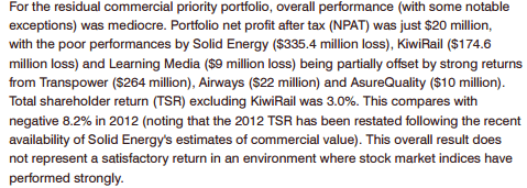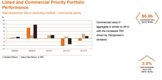 The portfolio generated a net loss after tax of $1.8 billion driven by a restructuring of KiwiRail’s balance sheet and reductions in bottom line results for Meridian and Solid Energy, affected by hydrology and coal market deterioration respectively.