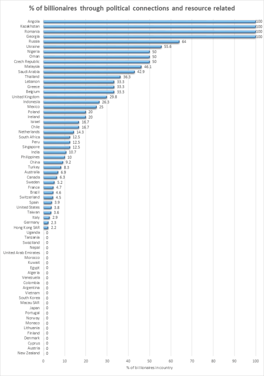 The 1826 Billionaires in the Forbes 2015 list are classified as rich through political connections if they made their money through past political positions, close relatives or friends in government, or questionable licenses, privatisations or resource extraction industries.