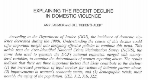 Farmer A, Tiefenthaler J. Explaining the recent decline in domestic violence. Contemporary Economic Policy. 2003;(2):158