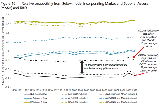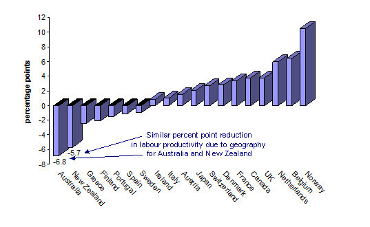 When New Zealand catches-up with Australia in labour productivity that will be the time to start worrying about the burden of geography – a burden that holds back relative productivity equally in both countries. You cannot explain the difference between Australia’s and NZ’s relative productivity by geographic factors they have in common.