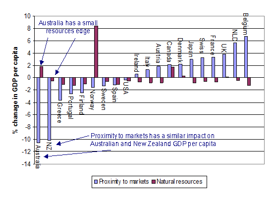 Figure 1: Estimated impact of proximity to markets and natural resources on real GDP per capita, OECD members, average for 2000-2004