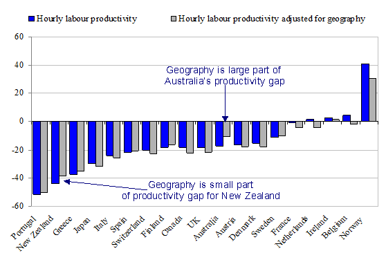 New Zealand’s apparent and geography adjusted productivity gaps with the USA are not far apart. In contrast, the OECD (2009c), geography cuts in half the gap in hourly labour productivity between the USA and Australia – see Figure 3.