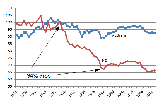 Figure 1 shows that New Zealand lost two decades of growth between 1974 and 1992 after level pegging with Australia for the preceding two decades.