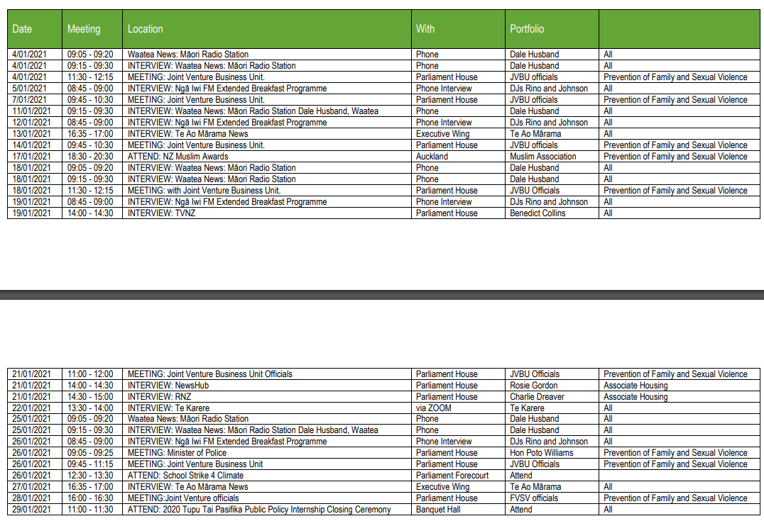 From https://www.beehive.govt.nz/search?f%5B0%5D=content_type_facet%3Aministerial_diary&f%5B1%5D=ministers%3A6679&f%5B2%5D=government_facet%3A6455 and http://www.beehive.govt.nz/sites/default/files/2021-02/Hon%20Marama%20Davidson%20Proactive%20Diary%20Jan%202021.pdf