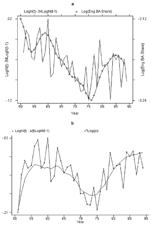 Figure 1: New entry flow of engineers: a, actual vs. imputed from changes in stock of engineers; b, time-varying coefficients.