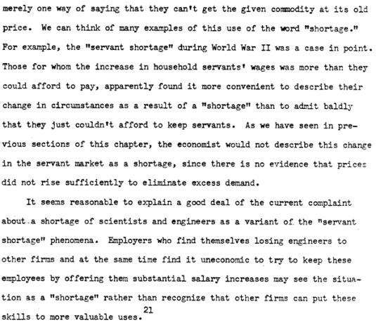 The onus is on those who advocate intervention to come up with hard evidence, rather than innate pessimism about markets that are poorly understood because of a lack of attempts to understand it. Studies dating back to the 1950s by George Stigler and by Armen Alchian found that the market for scientists and engineers works well and the evidence of shortages were more presumed than real.