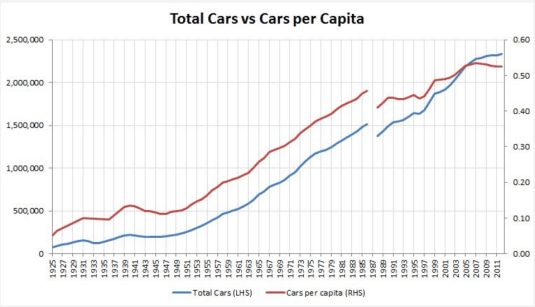 Transport Blog forgot previous data it dugout on trends in car ownership per capita in New Zealand since 1925. There is an explosive growth in car ownership from the 1950s onwards with the post-war economic boom. The roadbuilding that followed responded to this growing wealth of the New Zealand people rather than the other way round.