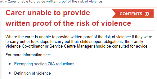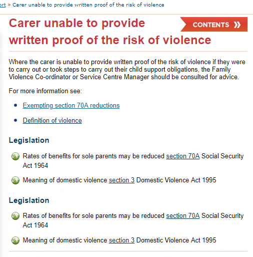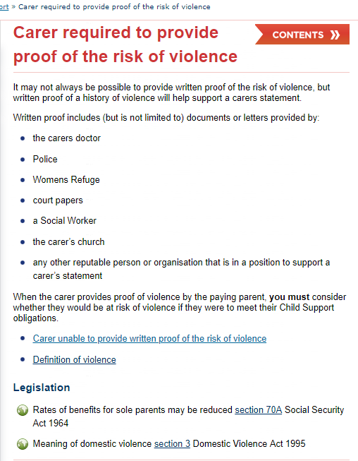 I clicked on the link Exempting section 70A reductions https://www.workandincome.govt.nz/map/income-support/core-policy/child-support/exempting-section-70a-reductions.html and then clicked on Risk of Violence link https://www.workandincome.govt.nz/map/income-support/core-policy/child-support/risk-of-violence-01.html and then clicked on Carer required to provide proof of risk of violence link https://www.workandincome.govt.nz/map/income-support/core-policy/child-support/carer-required-to-provide-proof-of-the-risk-of-violence.html