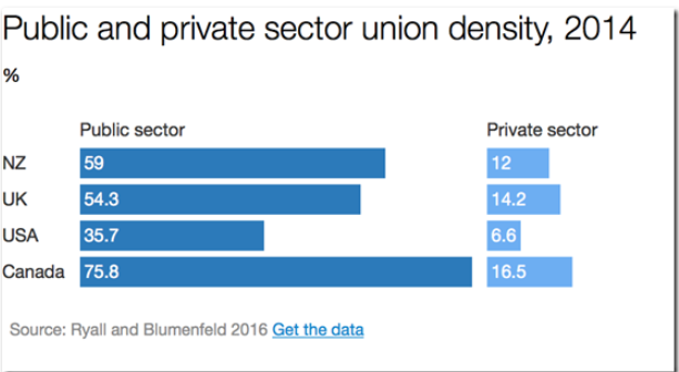 What is clear is unions are dead on their feet in the private sector. Struggling to keep membership in double digits as a share of the private sector workforce both at home and abroad.