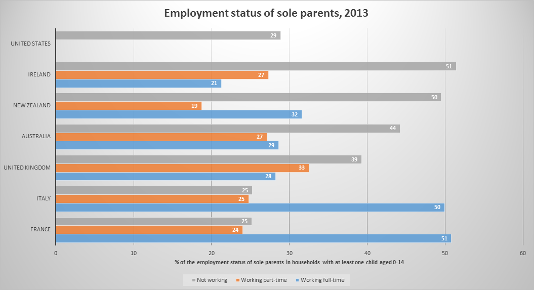 Despite supposedly having stingy welfare states, both New Zealand and Australia have a lot of sole parents who do not work at all. There is no separate breakdown of full-time and part-time work status in the USA. About 72% of sole parents in the USA either work full-time or part-time.