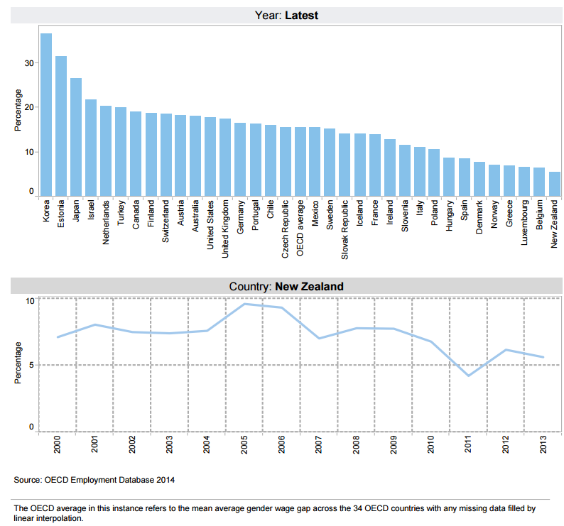 The Ministry of Women’s Affairs puts that gender wage gap estimate at 9.9% by measuring median hourly earnings, but the Ministry includes both full-time and part-time employees.