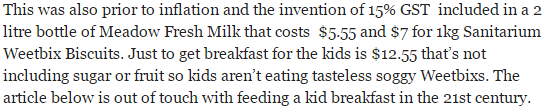 I completely agree with Joe. A 1 kg box of Weet-Bix costs $7 and a 2 L bottle of milk costs $5.55. I buy the cheaper brands of Weet-Bix than this myself.