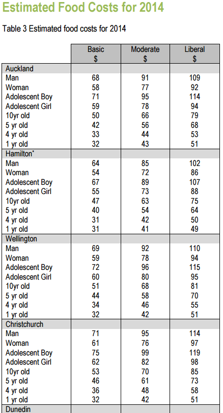 As shown from the screenshot above, the Otago University’s annual Food Cost Survey suggests that to meet basic needs, a family must spend $44 per week for a five-year-old and $34 per week for a four-year-old in Wellington, which is where I live. That is, it costs about five or six dollars per day per child to feed them. A liberal diet for a small child for a day costs not much more than a cup of coffee at a cafe where I’m going shortly. The real issue is the income of parents.