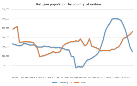 The British started to admit a great many more refugees at the end of the 1990s compared to the already large number admitted at the beginning. Italy is only started offering shelter to a significant number of asylum seekers since the end of the 1990s. The French have been pretty consistently admitting reasonable numbers of asylum seekers and adjusting their quota upwards in a crisis.