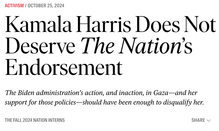 The Nation endorses Kamala Harris, but its interns object: “We cannot vote our way out of this genocide”