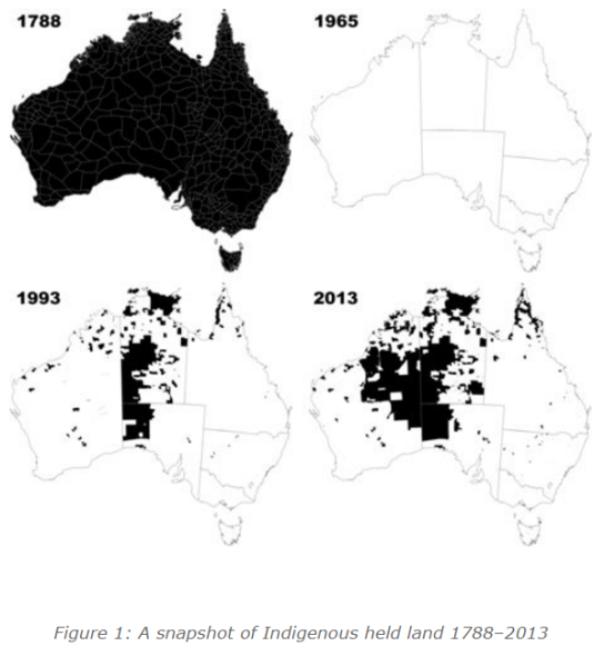 From 1965 onwards, 1/3rd of terrestrial Australia – 2.5 million sq kms of land – was returned to indigenous owners, with half of that since the Native Title decision in 1993. Tasmania pioneered aboriginal land rights with the Cape Barron Island Act 1912.