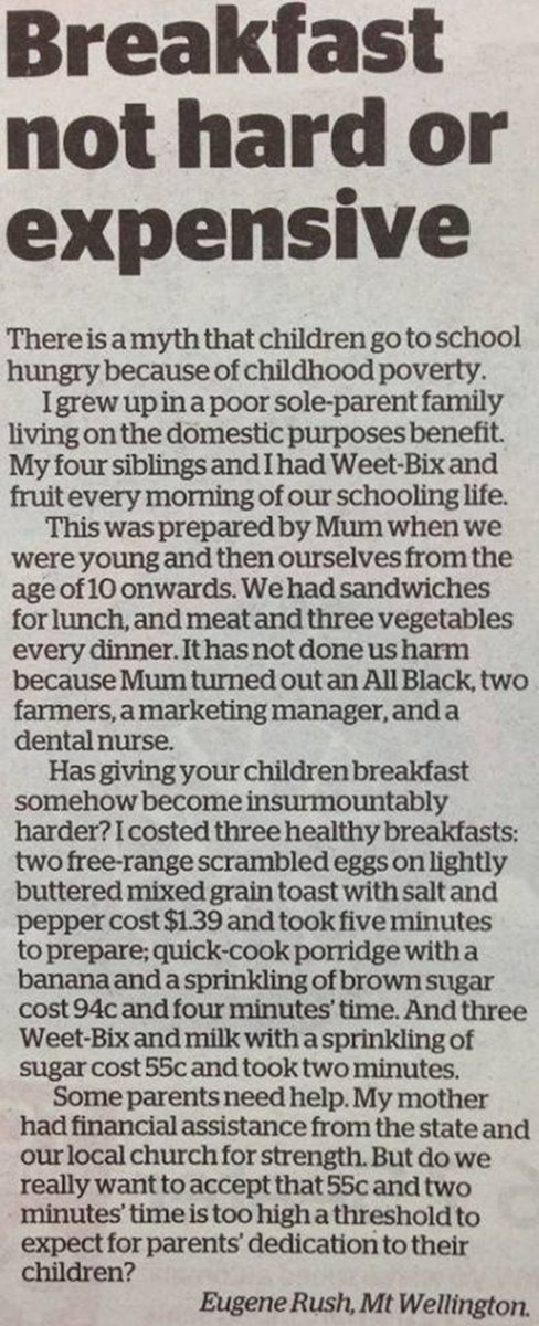 Joe Trinder, the Mana News editor, today blogged about the great expense of feeding the kids for ordinary families. In the course of doing so, he showed how extremely cheap it was for parents to make their children breakfast. The Far Left has inadvertently capitulated on school breakfast programmes been outside the reach of ordinary families.