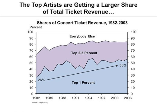 Each communications and information technology breakthrough allowed the very top entertainment acts to reach a larger fan base and a bigger share of concert revenue. The second-best are paid not much at all because everyone preferred to buy the best and can do so at a very low cost. The best of the best are, in consequence, handsomely rewarded.