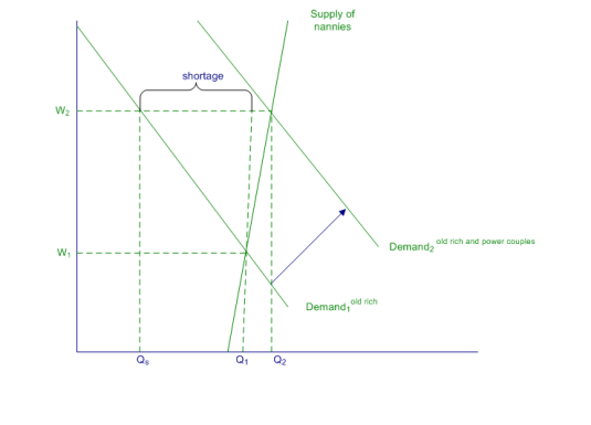 In the diagram above, the initial equilibrium has the old rich hiring Q1 nannies at a wage W1 with demand curve D1, and the supply curve for nannies.