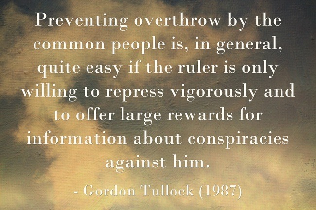 To stay in power, Tullock considers that an autocrat needs a moderately competent secret police willing to torture and kill, and a policy of rewarding generously those who betray coup plotters. Of course, the plotters must be shot.