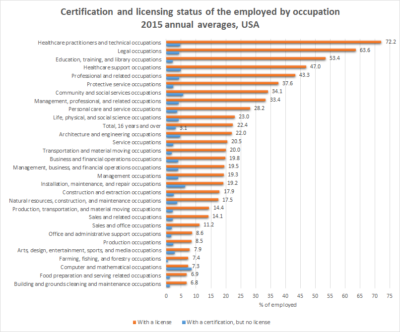 Source: Bureau of Labour Statistics, Labor Force Statistics from the Current Population Survey (2015), Certification and licensing status of the employed by occupation Table 5.
