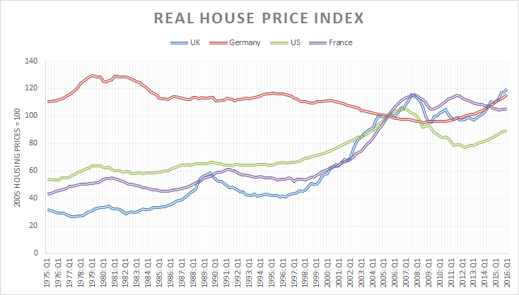 German, French, British, and US real housing prices, March 1975 to March 2016