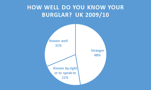 Something is known about the burglar in 45% of cases. In this rather invasive crime, half of burglaries are betrayals of trust or familiarity. More than a few of these burglaries might be committed by family members and friends wanting money for drugs but that is speculation.