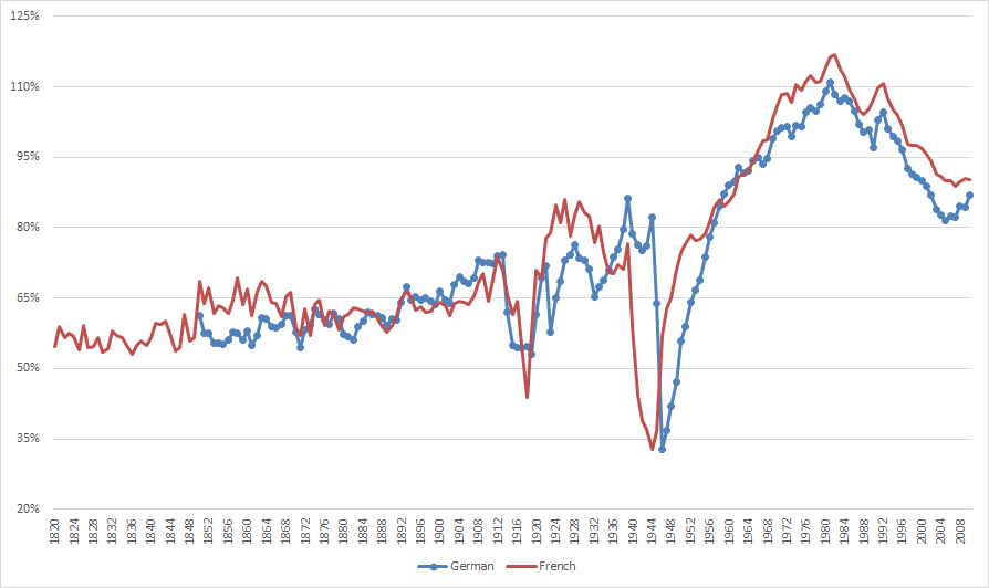 Figure 1: French and German real GDP per capita are as percentage of British GDP per capita (1990 Int. GK$PPP), 1820 – 2010
