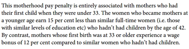 It would be handy to know why why these male chauvinistic employers have such strong prejudices against women who are mothers before the age of 33 but have few prejudices against women who are mothers after age 33.