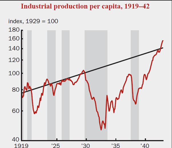 The recovery from the Great Depression was weak… Real gross domestic product per adult, which was 39 percent below trend at the trough of the Depression in 1933, remained 27 percent below trend in 1939. Similarly, private hours worked were 27 percent below trend in 1933 and remained 21 percent below trend in 1939.
