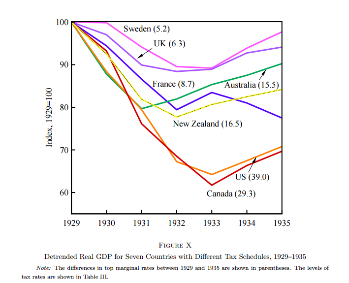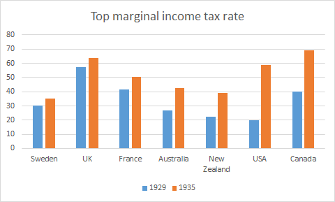 There were large differences in increases in the 1930s in the top marginal income tax rate between Sweden, the UK, France with Australia and New Zealand and between the USA and Canada and the rest as McGrattan explains: