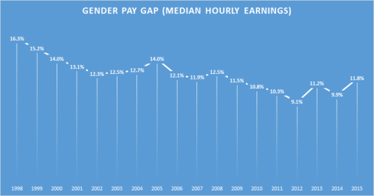 For example, as the chart below shows the unadjusted gender wage gap in New Zealand is a little bit less than the 14% claimed by Auckland YMCA when measured against median earnings and has been slowly tapering down for 15 years.