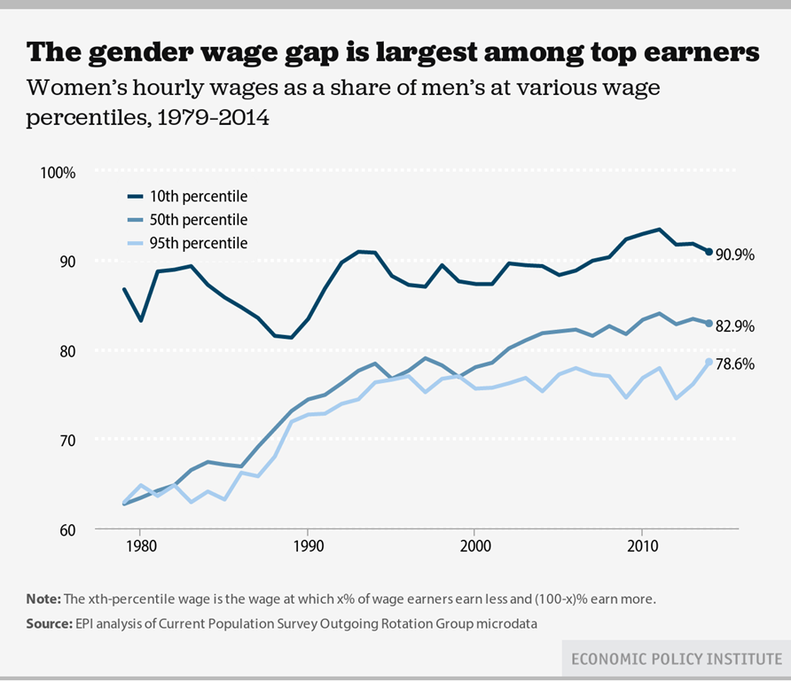 In 2014, the gap was smallest at the 10th percentile, where women earned 90.9 percent of men’s wages. The minimum wage is partially responsible for this greater equality among the lowest earners, as it results in greater wage uniformity at the bottom of the distribution.
