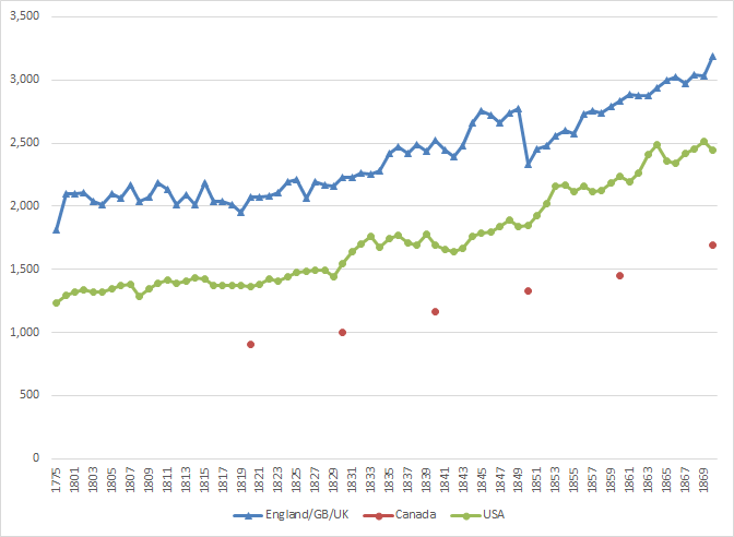 Figure 2: British, American and Canadian GDP per capita (1990 Int. GK$PPP), 1775 – 1870