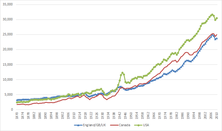 Figure 3: British, American and Canadian GDP per capita (1990 Int. GK$PPP), 1870 – 2010