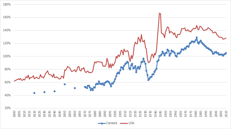 Figure 1: US and Canadian real GDP per capita are as percentage of British GDP per capita (1990 Int. GK$PPP), 1800 – 2010