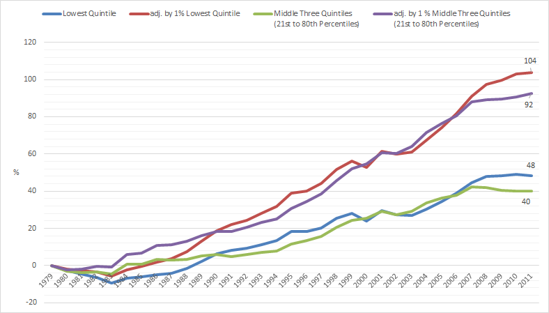 The Congressional Budget Office did its best to adjust after-tax incomes for inflation between 1979 in 2011. In figure 1, I added an extra 1% inflation adjustment in every year from 1979. 1% per annum is a common estimate of the inflation bias introduced by the inability of most measures of inflation to account for new goods and upgrades in the quality of existing goods to name but a few bias is in the measurement of consumer price inflation.