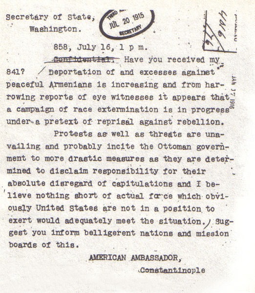 The Wiki entry on the contemporary reporting of the genocide is instructive with a scan of a 16 July 1915 U.S. diplomatic cable on this campaign of race extermination.