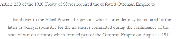 Article 230 of the 1920 Treaty of Sèvres required the defeated Ottoman Empire to hand over to the Allied Powers the persons whose surrender may be required by the latter as being responsible for the massacres committed during the continuance of the state of war on territory which formed part of the Ottoman Empire on August 1, 1914