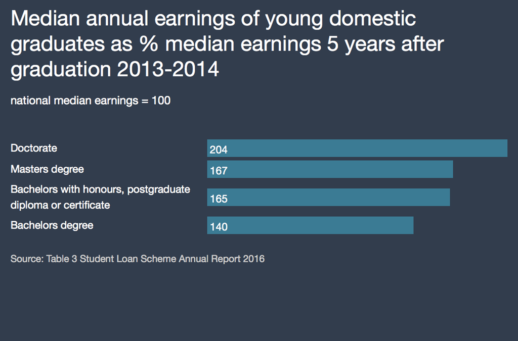Source: A Degree is a smart investment | Universities New Zealand – Te Pōkai Tara and Student Loan Scheme Annual Report 2016 | Education Counts