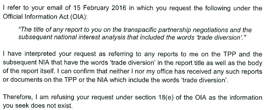 The New Zealand Minister of Trade and the Ministry of Foreign Affairs and Trade did not discuss this major risk even from the simplest preferential trading agreement in recent policy analysis of the TPPA as my Official Information Act request has revealed. The term trade version does not appear in any of their analysis.