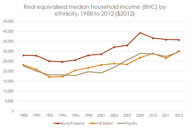 As shown in figure 4, between 1994 and 2010, real equivalised median New Zealand Pakeha household income rose by 47%; for Māori, this rise was 68%; for Pasifika, the rise in real equivalised median household income was 77%. These trends pass the difference principle developed by John Rawls.