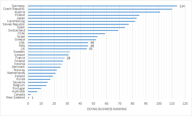 OECD starting a business rankings (New Zealand (1st) to Germany (114th)) – World Bank Doing Business rankings