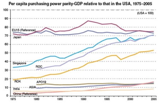 Japan has gone first to be last having been just overtaken in the last year or two by South Korea on a per capita real GDP basis, PPP. The Lost Decade certainly has taken its toll on Japanese relative prosperity. Singapore overtook Japan in the 1970s – a testament to the Singapore miracle. Hong Kong too overtook Japan on a purchasing power basis in the mid-1990s followed not long after by Taiwan. Singapore is seriously rich.